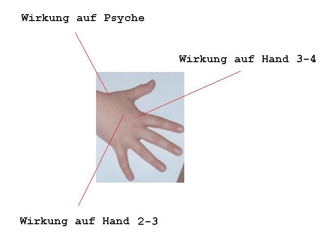 Handhinweispunkt. Nach Behandlung der Thuja-, Gelsemium- und Phosphorpunkte verschwinden die Handhinweispunkte 3,4,5 in der Reihenfolge.