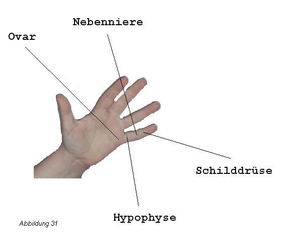 Die hormonaktiven Punkte befinden sich auf eine Linie, die durch die Mitte des Kleinfingers geht. Die Punkte sind die Mittelpunkte der