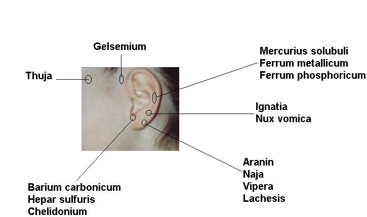 OÖ- Mittel. In einigen Fällen ist die periphere Auflage von Thuja nicht in der Lage den Thuja- Punkt am Ohr auszulöschen. Hier ist die zusätzliche Gabe von dem ersten OÖ- Mittel (meistens Ignatia) notwendig.